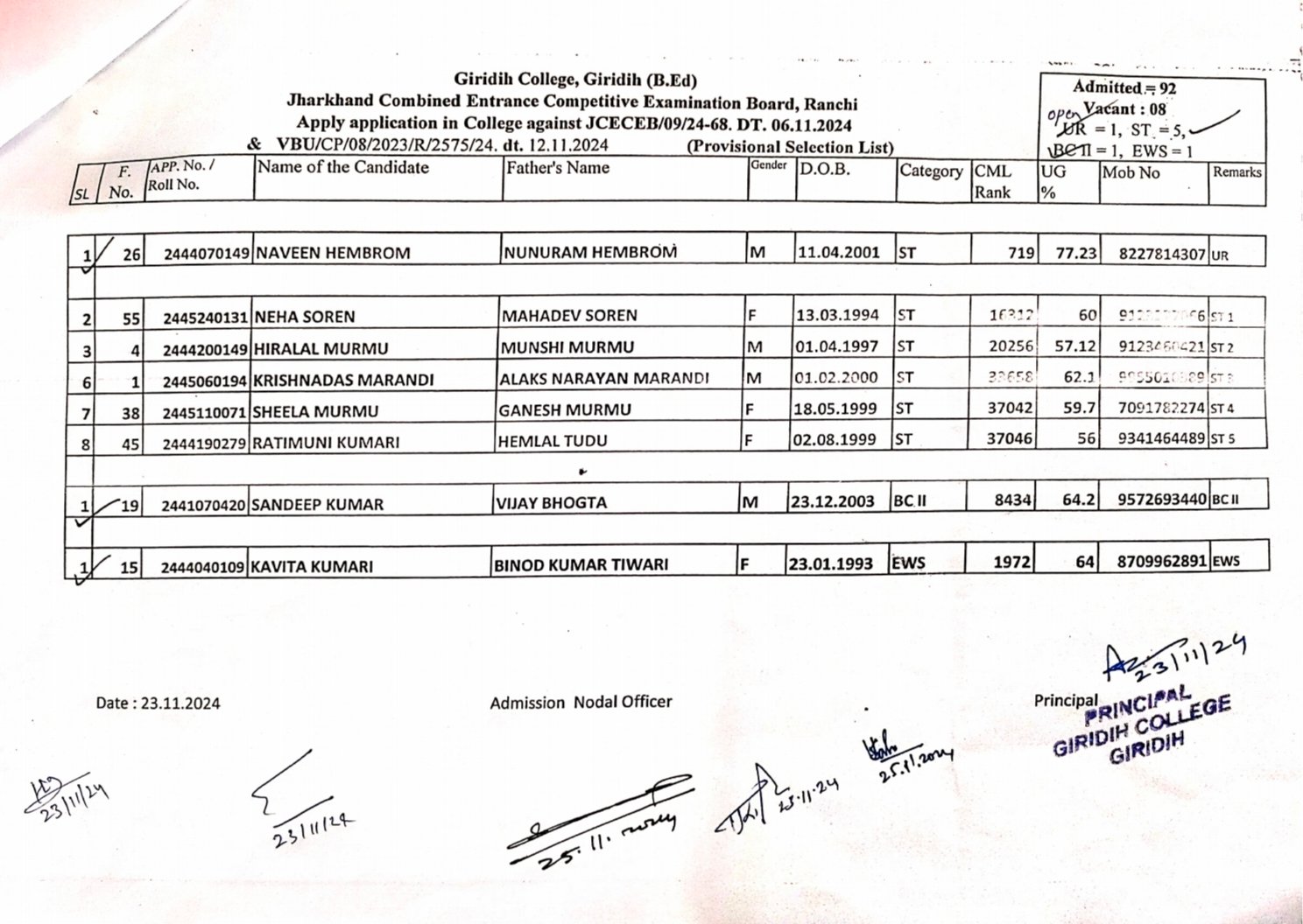 B.Ed. Selected 5th Merit List for vacant 02 UR seat in Session (2025-27)