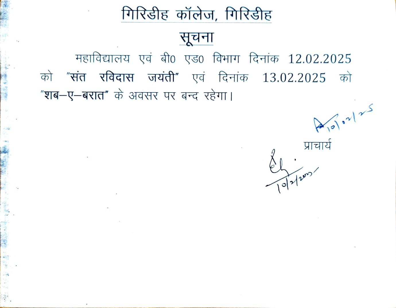 Giridih College was established under Contemporaneous Bihar University in 1955 by the eminent personalities & public representatives of Giridih to impart quality education in the society