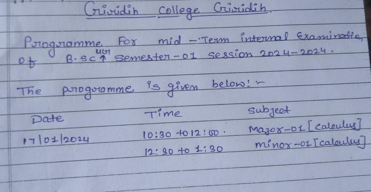 Mid-term internal Examination Programme of FYUGP Sem-I (2024-28) Mathematics (B.Sc.)
